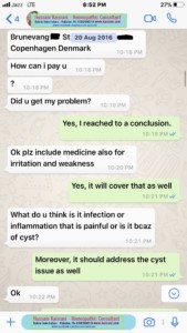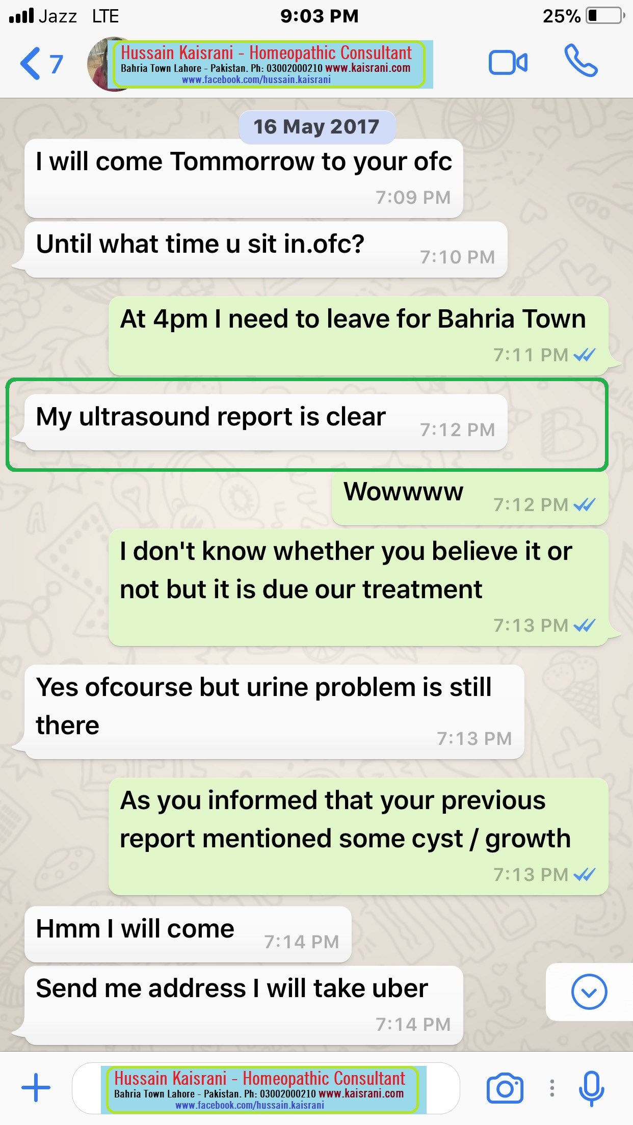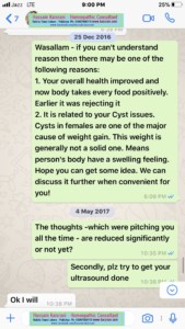 Even though she became symptom free, she was followed at intervals to inquire about any residual issues or anything eventful regarding health that still needed to be addressed. Given the progress of her case, she was expected to get clear of any cysts/growth in an estimated duration of 4 months time. Ultrasound was requested, but she was unable to get an appointment due to long waiting lists in Denmark. It kept on getting delayed untill she came to Pakistan and finally got her scan done. The persistent follow up turned out to be amazingly fruitful when on 16th May 2017 she reported that her ULTRASOUND REPORT IS CLEAR of all polycysts, fibroids / growth.