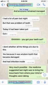 Pains originated at multiple sites following the course of treatment. They were addressed and settled down subsequently. Other issues in mental and emotional sphere became fine to the level where they stopped hindering usual routine activities. According to patient, she started witnessing a positive change in her concentration (She is a PhD scholar), mood, remains fresh and active through the day. Overall quality of life improved significantly and remarkably. She became almost symptom free after two and half month.