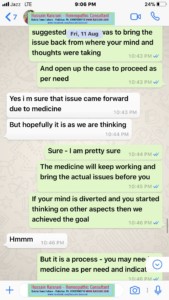 Due to detailed history taking and record keeping it became easier to correlate her current problem to her past history. After thorough telephonic interview, her miasmastic remedy was prescribed hoping that even if doesn’t address the issue, it will open up the case and will guide for further. Based on this conviction “Medorrhinum 1M” was prescribed.